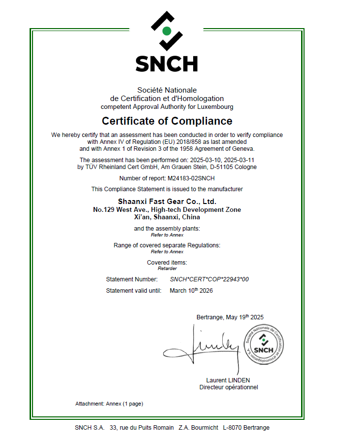 緩速器歐盟認(rèn)證生產(chǎn)一致性證書